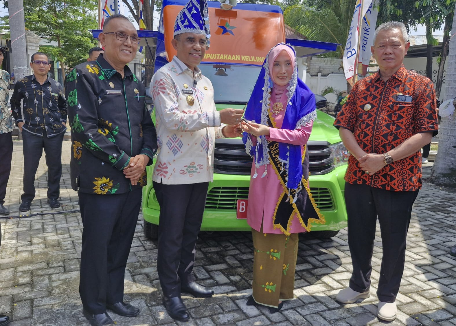 Sebagai bentuk dukungan terhadap penguatan gerakan literasi, Gubernur turut menyerahkan satu unit mobil perpustakaan keliling kepada Dispusaka Sulteng.