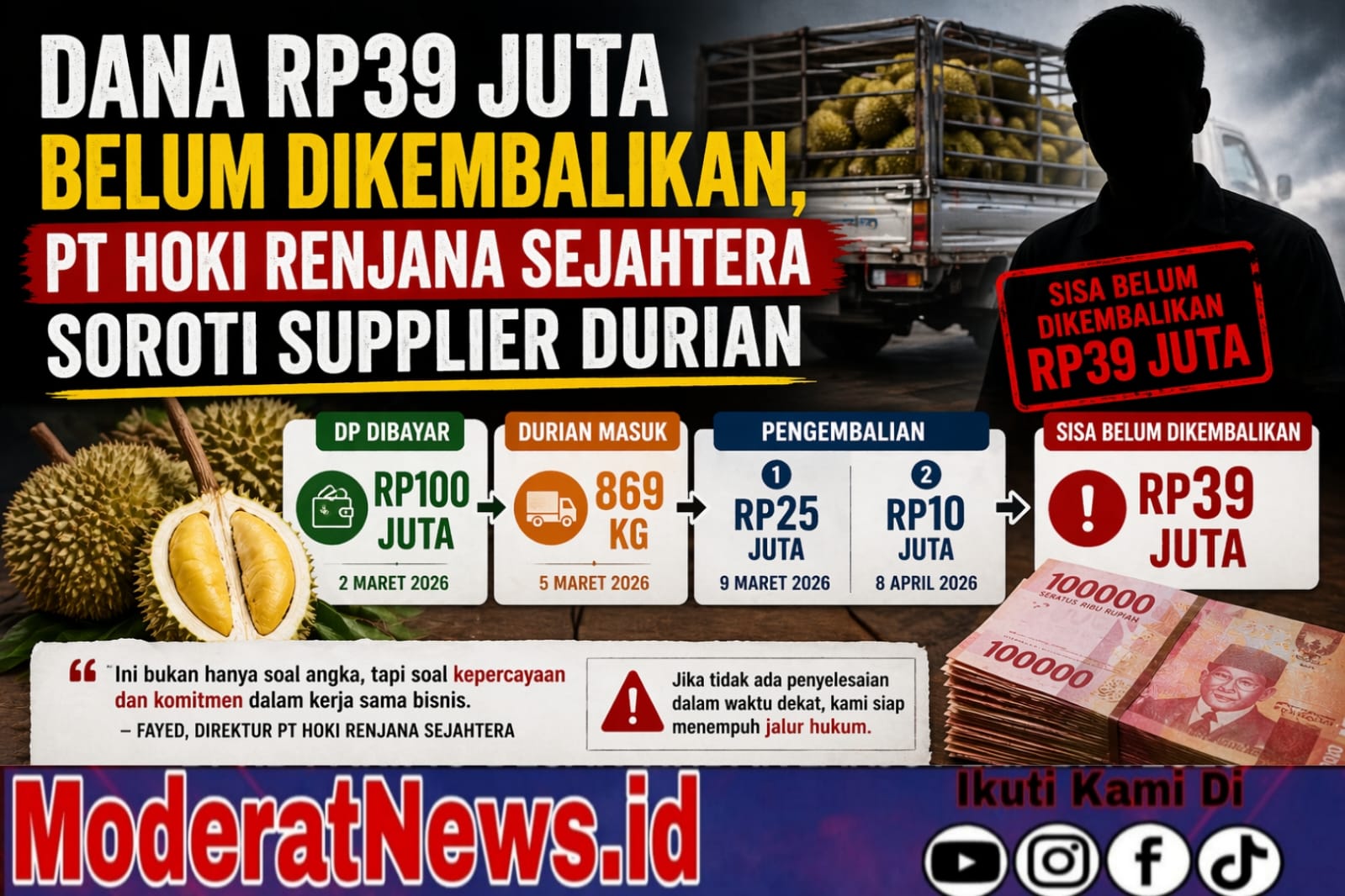 PARIGI MOUTONG, Moderatnews.id — PT Hoki Renjana Sejahtera akhirnya buka suara. Perusahaan ini menyoroti dugaan penahanan dana oleh salah satu supplier durian, Rifai Djamaluddin, yang hingga kini belum juga dituntaskan.
